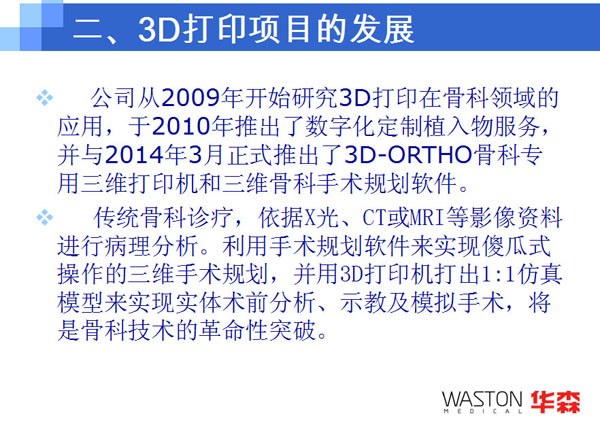2010年:總額為兩千萬(wàn)人民幣的二期設(shè)備投資已經(jīng)完成,其中包括更多的五軸加工中心、縱切機(jī)床、車削中心、慢走絲線切割等;與眾多醫(yī)學(xué)、材料學(xué)、力學(xué)等方面的專家以及多家科研機(jī)構(gòu)合作成立常州華森醫(yī)療科技有限公司;華森全球首發(fā)的專利“數(shù)字化定制植入物”經(jīng)過(guò)幾年攻關(guān)正式推向市場(chǎng)。