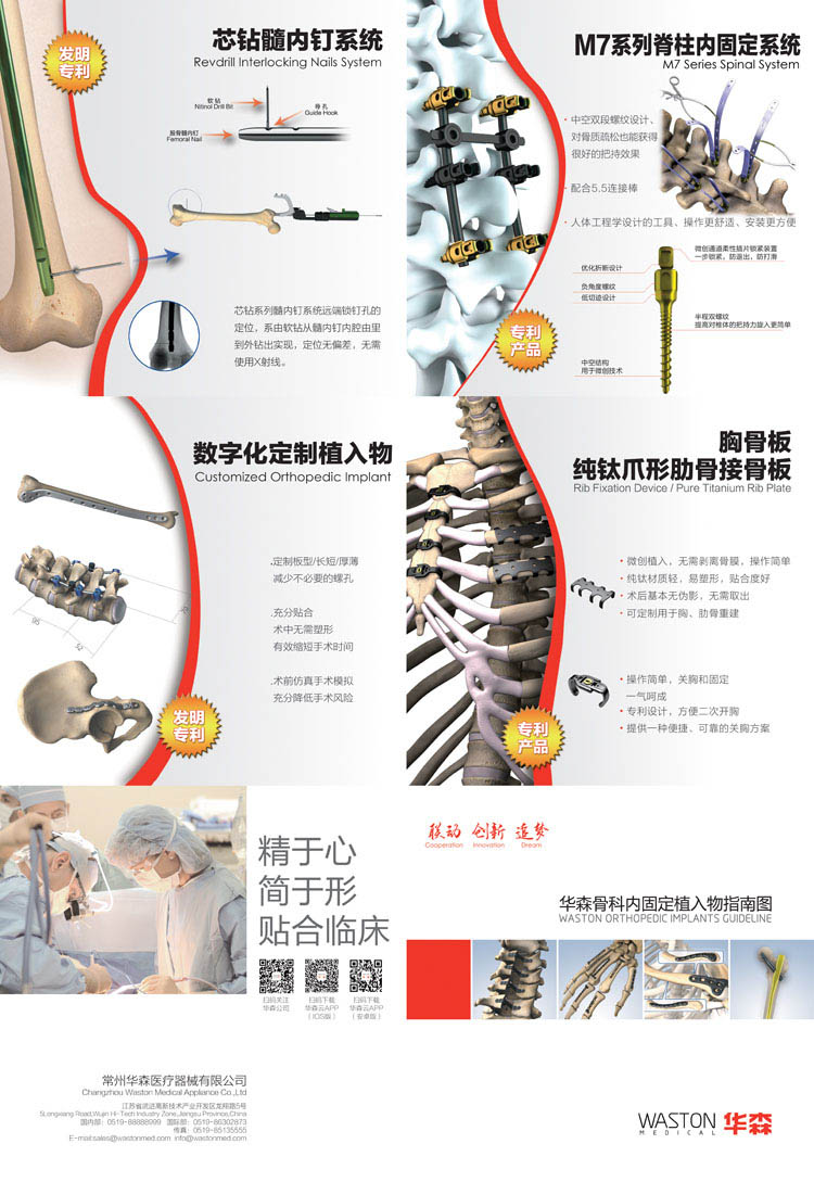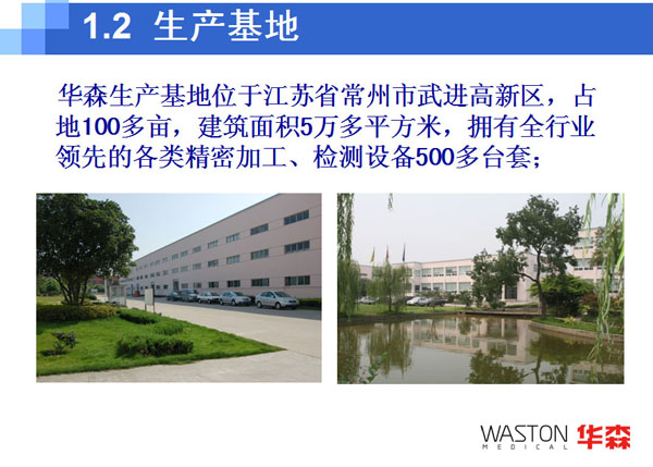 華森醫(yī)療集團(tuán)是常州聯(lián)合工具集團(tuán)控股的,由常州華森醫(yī)療器械有限公司、常州華森生物科技有限公司、常州華森醫(yī)療科技有限公司、華森三家聯(lián)動(dòng)科技創(chuàng)新中心、上海民衛(wèi)醫(yī)療器械有限公司等企業(yè)組成的集研發(fā)、制造、銷售、服務(wù)于一體的專業(yè)化醫(yī)療、健康產(chǎn)業(yè)集團(tuán)。 公司總部坐落于風(fēng)景秀麗的江南制造業(yè)基地——常州市武進(jìn)高新區(qū),西鄰常州飛機(jī)場(chǎng),北靠滬寧高速公路,南依沿江高速公路,交通十分便利。 集團(tuán)核心成員——常州華森醫(yī)療器械有限公司是由常州聯(lián)合工具集團(tuán)和日本オーテー株式會(huì)社在2001年聯(lián)合投資5000萬(wàn)人民幣成立的,專注于骨科、胸外科植入物等產(chǎn)品的開(kāi)發(fā)、制造、營(yíng)銷、服務(wù)的醫(yī)療器械專業(yè)廠家。自2001年成立以來(lái)已經(jīng)成為行業(yè)領(lǐng)先的和國(guó)內(nèi)最具活力的公司之一。 華森醫(yī)療公司采用事業(yè)部制管理結(jié)構(gòu),現(xiàn)公司下設(shè)為骨科事業(yè)部、吻合器事業(yè)部、手術(shù)工具事業(yè)部及胸外科產(chǎn)品事業(yè)部等四大事業(yè)部。主要生產(chǎn)三類6846骨科植入物及人工 、二類6801基礎(chǔ)外科手術(shù)器械、6825醫(yī)用高頻儀器設(shè)備、6808腹部外科手術(shù)器械及吻(縫)合器,專利爪型純鈦肋骨接骨板等產(chǎn)品。 公司三大生產(chǎn)基地占地面積100多畝,建筑面積35000多平方米,十萬(wàn)級(jí)凈化車間2000多平方米。中高級(jí)以上職稱的研發(fā)、生產(chǎn)、質(zhì)控、管理人員占員工總?cè)藬?shù)的30%以上。公司設(shè)備精良,擁有包括德國(guó)DMG、CHIRON、美國(guó)HASS五軸加工中心、日本STAR縱切機(jī)床、SODICK慢走絲線切割在內(nèi)的著名品牌加工中心及其它高精密度機(jī)械加工設(shè)備一百多臺(tái)套,檢測(cè)設(shè)備齊全。公司與北京協(xié)和醫(yī)院,北京軍區(qū)總醫(yī)院,南京醫(yī)科大學(xué)、蘇州大學(xué)等著名醫(yī)院、學(xué)院進(jìn)行學(xué)術(shù)、技術(shù)聯(lián)盟,并依托兩大母公司的雄厚實(shí)力形成了強(qiáng)大的研發(fā)力量和生產(chǎn)能力。 華森公司為ISO13485:2003(YY/T0287-2003)國(guó)際質(zhì)量體系認(rèn)證企業(yè),所有產(chǎn)品全面通過(guò)歐盟CE認(rèn)證,其中華森吻合器已經(jīng)率先獲得了美國(guó)FDA510(K)認(rèn)證。經(jīng)過(guò)幾年的努力,華森WASTON品牌產(chǎn)品不僅出口到南美、中東、東南亞、東歐、北非等發(fā)展中國(guó)家,而且已經(jīng)開(kāi)始進(jìn)入美國(guó)、法國(guó)、瑞士、德國(guó)、意大利、英國(guó)等歐美傳統(tǒng)發(fā)達(dá)國(guó)家。特別是與美國(guó)、歐洲的一些行業(yè)著名企業(yè)建立了合作聯(lián)盟關(guān)系,為華森產(chǎn)品達(dá)到或超過(guò)國(guó)際同類產(chǎn)品打下了堅(jiān)實(shí)的基礎(chǔ)。 我們歡迎國(guó)內(nèi)外新老客商、朋友前來(lái)華森考察洽談、技術(shù)交流、合作合資,與華森公司共創(chuàng)美好明天。