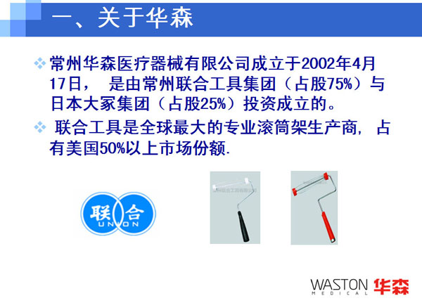 2001年:常州聯(lián)合工具集團(tuán)與日本オーテー株式會(huì)社在國(guó)家級(jí)常州高新技術(shù)區(qū)發(fā)區(qū)合資成立常州華森醫(yī)療器械有限公司,開(kāi)始涉足醫(yī)療產(chǎn)業(yè),為集團(tuán)產(chǎn)業(yè)多元化奠定基礎(chǔ);