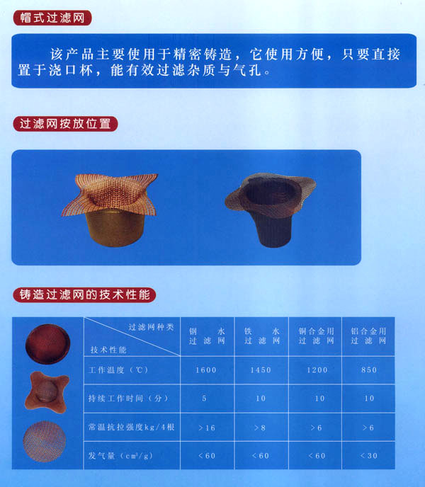 常州市猛將過濾網(wǎng)有限公司是專業(yè)生產(chǎn)系列鑄造過濾網(wǎng)的廠家。主要產(chǎn)品有:鐵水過濾網(wǎng)、鋼水過濾網(wǎng)、銅水過濾網(wǎng)、鋁水過濾網(wǎng)及熔模用帽式過濾網(wǎng)等。本廠產(chǎn)品是哈工大科研成果,榮獲國家經(jīng)委頒發(fā)的新技術(shù)成果獎。航天部科技進步一等獎;中國質(zhì)量檢驗協(xié)會授予“猛將”牌高硅氧過濾網(wǎng)“國家權(quán)威檢測達標(biāo)產(chǎn)品”榮譽證書;我廠生產(chǎn)的“四角帽式過濾網(wǎng)”獲國家專利局外觀設(shè)計專利證書;并獲香港國際新技術(shù)新產(chǎn)品博覽會“金獎證書”。2002年獲亞洲國際新技術(shù)新產(chǎn)品博覽會“科技發(fā)明進步獎”,2002年本廠所生產(chǎn)的“四角帽式過濾網(wǎng)在首屆“金艦杯”國際新技術(shù)成果網(wǎng)絡(luò)交易會活動中成績顯著,被評為金杯獎。同年在日內(nèi)瓦國際專利技術(shù)成果博覽會中被評為國際優(yōu)秀專利金獎。目前,本廠產(chǎn)品銷往全國各省、市、自治區(qū),是國內(nèi)銷量最大的廠家之一。同時出口韓國、泰國、東南亞等國家。進入21世紀以來,我國加入WTO后,我廠在哈工大葉榮茂教授的指導(dǎo)下,開發(fā)研制出一種多孔泡沫陶瓷過濾網(wǎng),該產(chǎn)品兼具玻璃纖維過濾網(wǎng)和直孔過濾網(wǎng)的篩分夾渣功能,且更具有吸附微小夾渣氧化物的功能。多孔泡沫陶瓷過濾網(wǎng)的主要工作原理是讓紊亂、翻騰的(TV urbuItnt Flow)金屬液經(jīng)過產(chǎn)品形成平穩(wěn)、均勻(SmoothFlow)的金屬液,金屬液經(jīng)過復(fù)雜的多孔泡沫陶瓷過濾網(wǎng),能有效地吸附截留微小氧化夾渣物,并溢除氣泡,然后能使鑄件產(chǎn)品達到純潔度高、強度高、韌性好、機械加工性能好等特點,從而能夠降低生產(chǎn)成本,提高產(chǎn)品成品率,增加經(jīng)濟效益。我廠熱忱歡迎廣大用戶使用該產(chǎn)品。 我公司設(shè)計發(fā)明的“四角帽式過濾網(wǎng)”,已在2001年3月申請專利,并于當(dāng)年11月底經(jīng)中華人民共和國知識產(chǎn)權(quán)局授權(quán)公告。頒布了外觀設(shè)計專利證書,證書號第207620號,F(xiàn)有個別廠家悍然侵權(quán),公然在有關(guān)鑄造媒體打出侵權(quán)產(chǎn)品廣告。對此,我們鄭重聲明,要求侵權(quán)廠家盡快采取糾正措施,為了維護我們的知識產(chǎn)權(quán),我們不排除采取法律行動的可能。