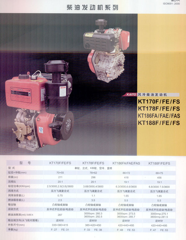 常州常柴集團(tuán)凱拓電動(dòng)機(jī)械有限公司是常柴集團(tuán)所屬,集自主研發(fā)設(shè)計(jì)及生產(chǎn)的出口型產(chǎn)業(yè)基地! 〕2窦瘓F(tuán)是一家擁有近一萬(wàn)名在職員工的國(guó)有大型企業(yè),年均產(chǎn)值近三億美元,平均出口總額近八千萬(wàn)美元,同時(shí)也是中國(guó)內(nèi)地五百?gòu)?qiáng)企業(yè)之一! 〕2窦瘓F(tuán)凱拓電動(dòng)機(jī)械有限公司的主要產(chǎn)品流水線基于日本YAMMAR型超級(jí)風(fēng)冷柴油發(fā)動(dòng)機(jī),以及其配套發(fā)電機(jī)組,水泵機(jī)組和數(shù)碼變頻發(fā)電機(jī),我司目前擁有常柴集團(tuán)及凱拓品牌的知名商標(biāo)使用權(quán),旗下所有分廠如機(jī)械加工廠、鑄造廠以及發(fā)動(dòng)機(jī)廠等生產(chǎn)基地都通過(guò)了ISO9001-2000質(zhì)量管理體系認(rèn)證。我司自主品牌凱拓柴油發(fā)電機(jī)組KT5000SE,KT5000LE,數(shù)碼變頻發(fā)電機(jī)KT1000Ti以及柴油發(fā)動(dòng)機(jī)186F均通過(guò)德國(guó)TUV公司的CE認(rèn)證,美洲EPA認(rèn)證,因此出口量很大,近年來(lái)公司產(chǎn)品已遠(yuǎn)銷美洲、歐洲、非洲以及東南亞國(guó)家和地區(qū)! ∫劳谐2窦瘓F(tuán)的領(lǐng)先技術(shù),強(qiáng)有力的管理體制,以及健全的產(chǎn)品質(zhì)量體系,我司通過(guò)不斷優(yōu)化自主設(shè)計(jì)研發(fā),完善管理機(jī)制,期望能夠以提供最優(yōu)質(zhì)的產(chǎn)品售后服務(wù)進(jìn)一步拓展國(guó)際市場(chǎng)! ”局皥F(tuán)結(jié)、合作、奮斗”的公司理念,我們希望著眼全球,與更多潛在的客戶開展合作交流,最終實(shí)現(xiàn)雙贏的戰(zhàn)略目標(biāo)。