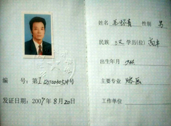 毛懷青,江蘇常州市武進人。 中國工藝美術學會會員,常州市中國烙畫研究會副會長,常州市文博鑒賞協(xié)會理事,非物質文化遺產烙畫傳承人。高級工藝美術師。 年輕時學習國畫、油畫中年蔓現(xiàn)掌州咯畫源遠流長、歷史悠久,有著其它美術門類不具備的藝術風格與特色?芍^是工藝美術中的一朵十分亮麗的藝術奇葩,是我民族先人給我們留下的一份不可多得十分珍貴的一份文化遺產。為弘揚與發(fā)展這份優(yōu)秀文化遺產,我從此下定決心研究烙畫,愿付出一份力量為振興烙畫事業(yè)做出貢獻。至今已潛心研究幾十年,取得了可喜的成績,被業(yè)界公認,社會關注與認可。有“江南烙畫第一筆”之美譽。 近年來,創(chuàng)作的烙畫作品分別獲得過全國、省市級的金、銀、銅獎多次。中央電視臺曾兩次播放過本人的烙畫作品,江蘇電視臺、常州電視臺也曾多次播放過本人的作品與烙畫藝術生涯,揚子晚報、常州日報、常州晚報也曾多次報導過本人的烙畫作品,出版物有三種版本都能查閱到介紹本的烙畫從藝生涯與藝術業(yè)績。