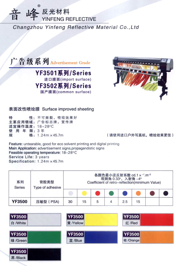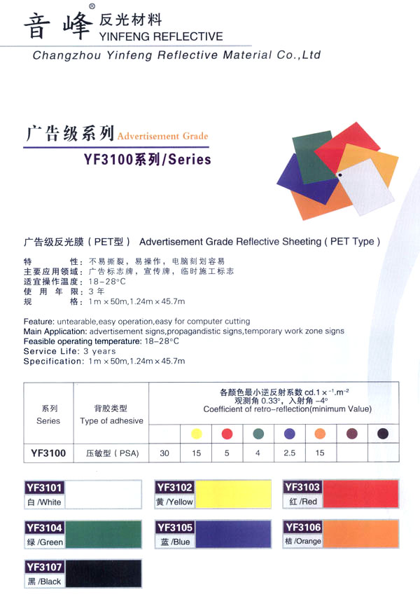 公司主生產(chǎn):廣告級反光膜、工程級反光膜、車牌級反光膜、高強(qiáng)級反光膜、廣告級反光雙色條、發(fā)光膜、噴繪反光膜、晶彩格、電信電力反光膜,鍍鋁膜等等..........根據(jù)國家指令法規(guī):反光材料的領(lǐng)域,如公路標(biāo)志、標(biāo)牌、標(biāo)線、礦山、鐵路等......... 反光膜廣泛應(yīng)用于各種廣告標(biāo)志牌,公路鐵路的導(dǎo)向牌、指示牌、地名牌、車牌,道路交通標(biāo)志,物業(yè)小區(qū)標(biāo)志,臨時施工標(biāo)志,廣告宣傳、安全防護(hù)、高等級公路的各種警示標(biāo)語,標(biāo)識牌等。