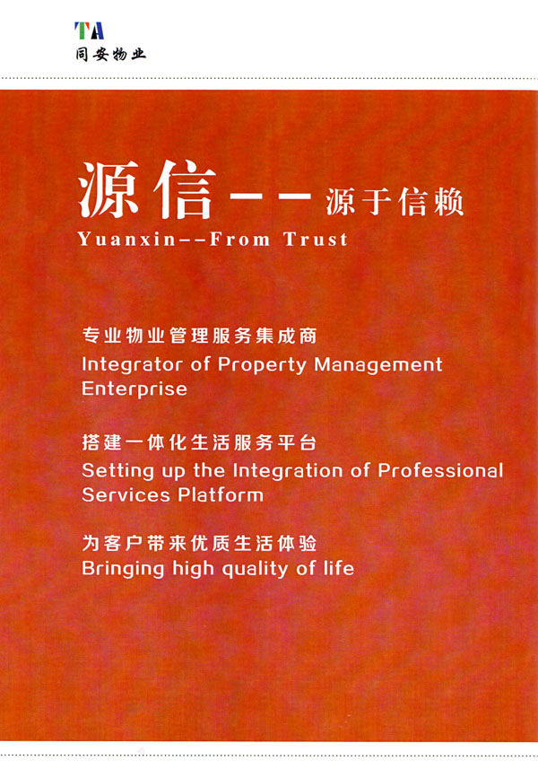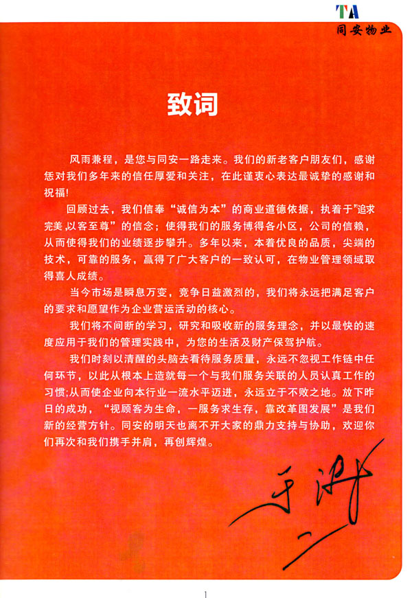 常州市同安物業(yè)管理有限公司注冊(cè)1999年,發(fā)展至今已有多年歷史,本公司坐落于美麗的龍城常州,秉承“融聚無(wú)限未來(lái)”的核心理念,融專業(yè)認(rèn)才,匯優(yōu)質(zhì)資源以”專心,細(xì)心,耐心”的服務(wù)態(tài)度,為客戶打造“安心,順心,稱心”的服務(wù)感受。 公司始終以“打造中國(guó)最值得信賴和最值得尊重的物業(yè)管理服務(wù)集成商”為愿景自我鞭策,不斷前行。同安物業(yè)以客戶滿意為終極目標(biāo),不斷加強(qiáng)”崗位資格認(rèn)證能力,人才招聘與職業(yè)化培訓(xùn)能力,產(chǎn)品策劃與管理設(shè)計(jì)能力,品質(zhì)監(jiān)督與管控能力,技術(shù)更新與運(yùn)營(yíng)優(yōu)化力“五大專業(yè)能力的培養(yǎng)和提升,實(shí)現(xiàn)“精品化管理,專業(yè)化服務(wù)”。 公司發(fā)展至今,員工總數(shù)近千余人,大專以上學(xué)歷200多人,中高級(jí)技術(shù)人員160人,維修人員140人,物業(yè)管理師80名,公司接管面積達(dá)3100000多平方米,設(shè)涉及住宅小區(qū),別墅,大型游樂(lè)場(chǎng),公園,醫(yī)院,廠區(qū),商業(yè)等。公司的工作管理逐步導(dǎo)入ISO9001質(zhì)量體系和ISO4001環(huán)境管理體系和GB/T28001職業(yè)健康安全管理體系,嚴(yán)格按照質(zhì)量體系的標(biāo)準(zhǔn)執(zhí)行。