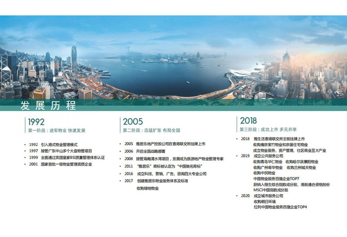 一、立足北上廣,面向全中國,走向全世界 1992年,雅居樂物業(yè)開篇中山,率先引入港式物業(yè)管理模式。1997年,依托雅居樂地產(chǎn)的崛起,連續(xù)接管中山多個項目,成為高端大盤物業(yè)管理的領(lǐng)跑者。1999年,雅居樂物業(yè)開啟專業(yè)化發(fā)展模式,全面通過英國皇家BSI的ISO9000質(zhì)量管理體系認(rèn)證,2001年成為國家首批一級物業(yè)管理資質(zhì)企業(yè)。 2002年,隨著廣州雅居樂花園的盛大啟幕,雅居樂物業(yè)邁開向廣州進(jìn)軍的步伐。為尋求更長遠(yuǎn)的發(fā)展,雅居樂積極構(gòu)思上市藍(lán)圖,2005年在香港成功上市。在深耕珠三角城市群的同時,2006年雅居樂物業(yè)揮師北上,正式開啟全國部署戰(zhàn)略。2008年,接管海南清水灣項目,揭開旅游地產(chǎn)物業(yè)管理的新篇章。 接下來近十年里,雅居樂物業(yè)始終保持著最年輕的成長姿態(tài),依托“管理數(shù)字化、服務(wù)專業(yè)化、流程標(biāo)準(zhǔn)化和操作機(jī)械化”的發(fā)展戰(zhàn)略,雅居樂物業(yè)榮膺2018中國物業(yè)服務(wù)百強(qiáng)企業(yè)第11名,2018年中國物業(yè)服務(wù)百強(qiáng)企業(yè)成長性第二名、2018年中國物業(yè)服務(wù)百強(qiáng)服務(wù)質(zhì)量領(lǐng)先企業(yè)、2018年中國物業(yè)服務(wù)百強(qiáng)滿意度領(lǐng)先企業(yè)、2018中國物業(yè)服務(wù)百強(qiáng)經(jīng)營績效領(lǐng)先企業(yè)、旅游地產(chǎn)物業(yè)管理領(lǐng)先品牌、2018年中國辦公物業(yè)管理優(yōu)秀企業(yè)(綠地物業(yè))、2017中國物業(yè)管理企業(yè)品牌價值第12名、2017中國物業(yè)管理企業(yè)綜合實力第12名、中國藍(lán)籌物業(yè)企業(yè)、《旅游地產(chǎn)物業(yè)管理服務(wù)標(biāo)準(zhǔn)》(團(tuán)體標(biāo)準(zhǔn))起草工作等多項殊榮。 目前,雅生活集團(tuán)已形成廣州、中山、深圳、南京、上海、西安、成都、海南、云南、北京、鄭州、南寧、沈陽、武漢、馬來西亞十五大城市公司全面發(fā)展的蓬勃態(tài)勢。截止2017年12月31日,雅生活集團(tuán)管理范圍覆蓋全國逾69座城市與地區(qū),服務(wù)類型涵蓋主流住宅、高端豪宅、旅游地產(chǎn)、商業(yè)、寫字樓等多種業(yè)態(tài),合約總建筑面積為12610萬平方米,擁有200多個項目,服務(wù)業(yè)主逾100萬人。 2017年6月,雅生活集團(tuán)收購綠地物業(yè)100%股權(quán),并與綠地集團(tuán)簽署戰(zhàn)略合作協(xié)議,8月,綠地集團(tuán)投資10億元獲得雅生活集團(tuán)20%股權(quán)。未來,雅生活集團(tuán)將實施“雅居樂物業(yè)”與“綠地物業(yè)”雙品牌驅(qū)動戰(zhàn)略,還將尋求在A股上市,力爭打造中國物業(yè)“A+H”第一股。
