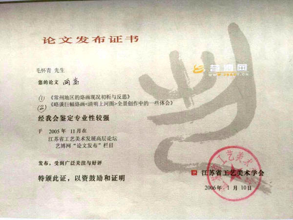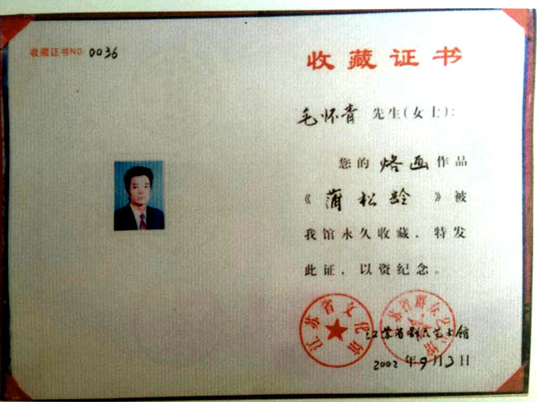 毛懷青,江蘇常州市武進(jìn)人。 中國工藝美術(shù)學(xué)會會員,常州市中國烙畫研究會副會長,常州市文博鑒賞協(xié)會理事,非物質(zhì)文化遺產(chǎn)烙畫傳承人。高級工藝美術(shù)師。 年輕時(shí)學(xué)習(xí)國畫、油畫中年蔓現(xiàn)掌州咯畫源遠(yuǎn)流長、歷史悠久,有著其它美術(shù)門類不具備的藝術(shù)風(fēng)格與特色。可謂是工藝美術(shù)中的一朵十分亮麗的藝術(shù)奇葩,是我民族先人給我們留下的一份不可多得十分珍貴的一份文化遺產(chǎn)。為弘揚(yáng)與發(fā)展這份優(yōu)秀文化遺產(chǎn),我從此下定決心研究烙畫,愿付出一份力量為振興烙畫事業(yè)做出貢獻(xiàn)。至今已潛心研究幾十年,取得了可喜的成績,被業(yè)界公認(rèn),社會關(guān)注與認(rèn)可。有“江南烙畫第一筆”之美譽(yù)。 近年來,創(chuàng)作的烙畫作品分別獲得過全國、省市級的金、銀、銅獎(jiǎng)多次。中央電視臺曾兩次播放過本人的烙畫作品,江蘇電視臺、常州電視臺也曾多次播放過本人的作品與烙畫藝術(shù)生涯,揚(yáng)子晚報(bào)、常州日報(bào)、常州晚報(bào)也曾多次報(bào)導(dǎo)過本人的烙畫作品,出版物有三種版本都能查閱到介紹本的烙畫從藝生涯與藝術(shù)業(yè)績。
