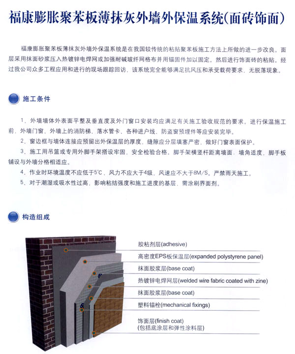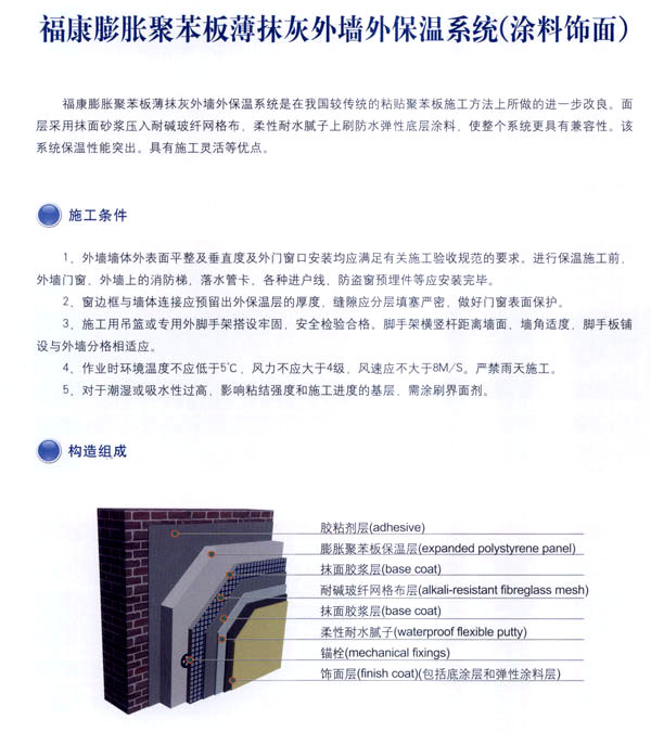 常州市?敌滦徒ú挠邢薰臼且匝兄崎_發(fā)、生產、銷售、施工、技術服務為一體的化學建筑材料的專業(yè)企業(yè),通過與歐洲著 名建筑材料公司和國內權威科研機構合作,并聘請國家級專家為技術顧問,開發(fā)出適合我國市場的福康EPS、XPS及聚苯顆粒外墻外保溫節(jié)能系統(tǒng)。 公司的生產線全部采用國內先進的電腦控制自動化設備,配備了專業(yè)的實驗中心,并且采用進口的可再分散乳膠粉為基料,確保?低鈮ν獗毓(jié)能系統(tǒng)具有性能優(yōu)異、安全可靠,綠色環(huán)保、適用性強的高品質特點。 公司開發(fā)的\'?低鈮ν獗叵到y(tǒng)\'被列為江蘇省科技成果推廣項目。整個生產流程依照質量體系的要求,實行嚴格的監(jiān)控和檢測,為生產優(yōu)質產品提供保證。高品質的?低鈮ν獗叵到y(tǒng),提供從熱工設計、產品開發(fā)、生產銷售及工程施工全程服務的一體化解決方案。 公司本著“綠色環(huán)保、節(jié)約能源、造福人類”的理念。用我們一流的產品和優(yōu)秀的服務,打造出一個個節(jié)能康居示范工程,為人類營造出舒適健康的居住環(huán)境。我們愿為中國節(jié)能事業(yè)的發(fā)展積極努力,更上一層樓。 公司組建高效的生產經營管理模式,設立專業(yè)技術服務機構。配備售后的優(yōu)質服務。實行原材料、運輸、安裝一條龍服務。經本公司施工之后,貴公司可以直接批涂料、裝門窗、貼瓷磚,保證絕無任何質量問題。