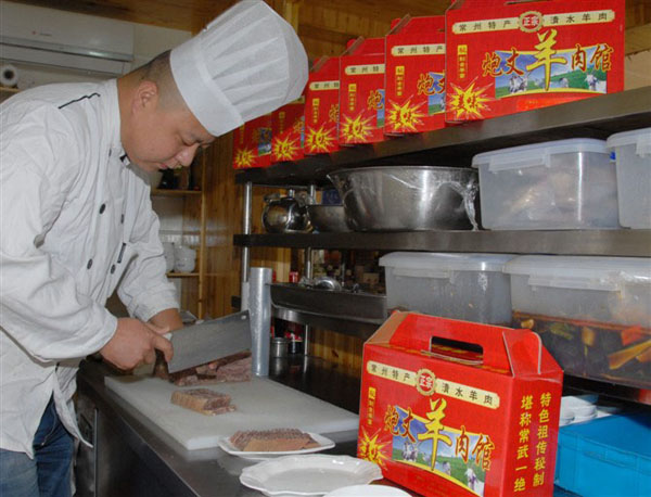 談家的羊肉館位于鄭陸老街上,深秋的一天,記者來到這家羊肉館,穿過大堂走到廚房里,幾名工人正在忙著處理羊肉。余菊華穿著大紅色的薄毛衣,坐在桌子旁,正在麻利地剔著羊肉上的肥油。她是羊肉館的老一代老板娘,如今和老伴談仲興一起,仍天天來店里幫著兒子談旭東打下手。余阿姨隨手拿過一塊長方形的肉皮,用一把小刮刀撳在上面,輕輕地刮著,一團團白白的油被剔了下來,堆在一邊。“我家的羊肉弄得干凈的,腿上的肥肉還有筋筋拉拉的東西,全都要弄掉,就是自己家買了豬肉燒紅燒肉,也不可能弄到這么干凈的,F(xiàn)在的客人都怕胖,所以一定要處理得干干凈凈!庇喟⒁陶f。剔好的肉皮是用來熬成皮凍然后混和著羊肉壓制成羊糕的,只有清理得干凈,沒有一點雜質(zhì),羊糕的質(zhì)量才會好。