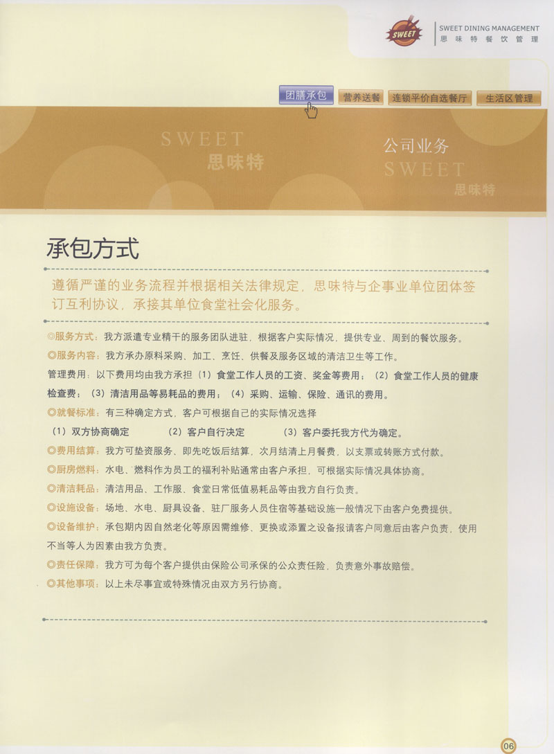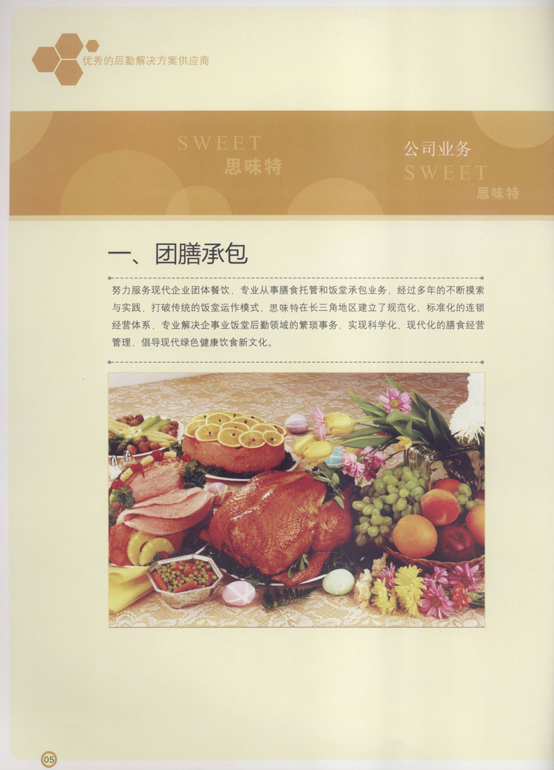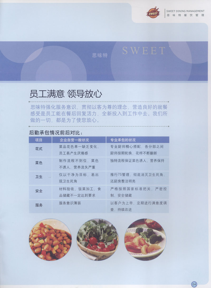 常州市思味特餐飲有限公司是一家專業(yè)從事企事業(yè)后勤服務(wù)的有限責(zé)任公司,公司從承包食堂起步,逐漸發(fā)展為經(jīng)營(yíng)團(tuán)膳承包、營(yíng)養(yǎng)送餐、生活區(qū)管理、連鎖餐廳的綜合型企業(yè)。2008年公司斥資100萬元,在常州興建了可以同時(shí)提供3000餐膳食的中央廚房,重點(diǎn)打造“和美客”后勤服務(wù)品牌,全力為企事業(yè)單位解決后勤后顧之憂。 到目前為止,我們合作成功的企事業(yè)單位超過50多家,服務(wù)人數(shù)突破15萬,合作單位包括國(guó)家機(jī)關(guān)、國(guó)有企業(yè)、三資企業(yè)、民營(yíng)企業(yè)、學(xué)校、醫(yī)院等,其中不乏國(guó)際知名品牌公司。 和美客愿為更多的國(guó)內(nèi)外企事業(yè)單位及機(jī)關(guān)團(tuán)體分憂解難,從廚房設(shè)計(jì)、菜品配送、團(tuán)膳承包、到生活區(qū)管理等提供全方位的服務(wù)。