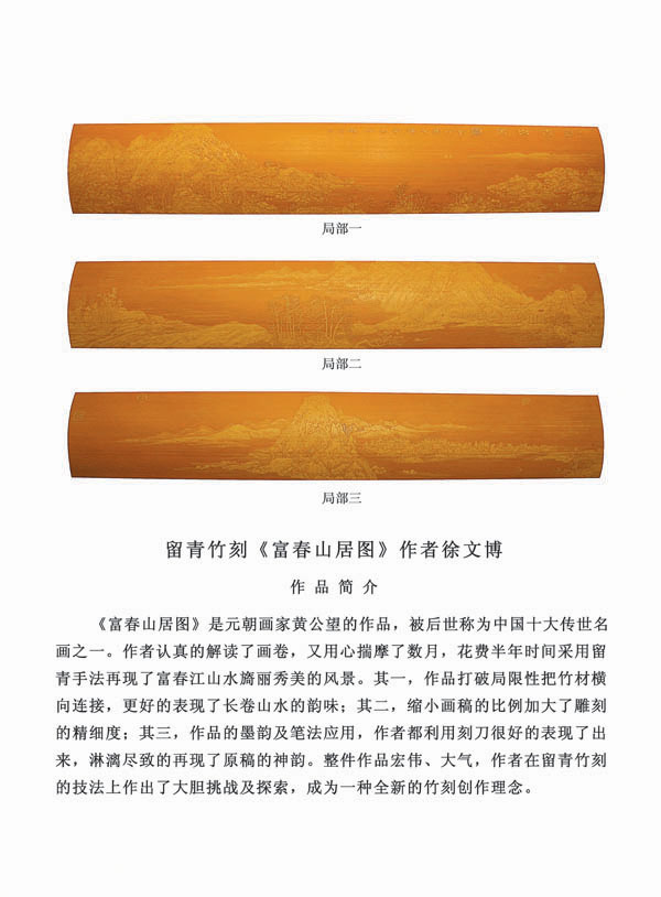 徐博(藝名文博),1973年生,江蘇武進(jìn)人,江蘇省省名人,高級(jí)工藝美術(shù)師,常州市留青竹刻非遺傳承人,常州工藝美術(shù)家協(xié)會(huì)理事,被譽(yù)為當(dāng)今中國(guó)最具創(chuàng)新意識(shí)的新銳竹刻家代表,多次獲得國(guó)家工藝美術(shù)大獎(jiǎng)。酷愛留青竹刻的徐文博賞竹為樂,以竹詠志,借竹抒懷,悉心探索留青竹刻的藝術(shù)表現(xiàn)。在中國(guó)工藝美術(shù)大師蕭劍波的精心指導(dǎo)下,開創(chuàng)留青水墨山水之技法,更好的體現(xiàn)了竹刻淡雅清秀的藝術(shù)風(fēng)格,并不斷汲取書畫、攝影、雕塑等藝術(shù)精華,不斷滋養(yǎng)藝術(shù)情趣,提升擴(kuò)展胸襟人格的同時(shí)也逐步形成了其形神兼?zhèn),虛?shí)相生,氣韻生動(dòng)的藝術(shù)特點(diǎn),作品為眾多的國(guó)內(nèi)外收藏家珍藏。