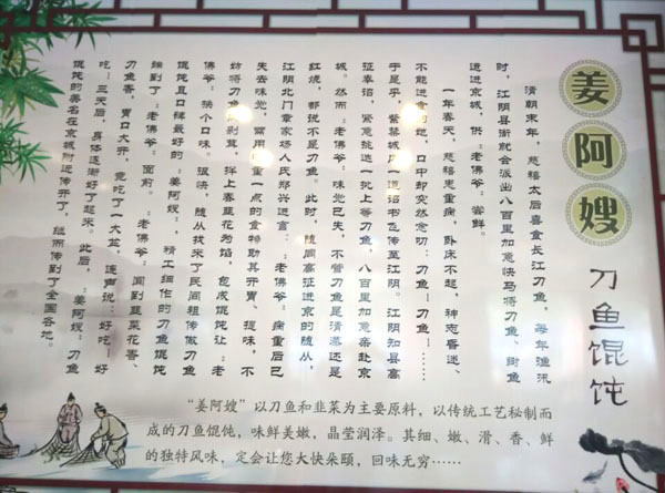 武進(jìn)高新區(qū)姜阿嫂刀魚餛飩店經(jīng)營面積480平方米,可容納150人左右用餐,主要特色刀魚餛飩,蟹黃大湯包,榮獲“江蘇省鄉(xiāng)村美食節(jié)”金獎(jiǎng)和銀獎(jiǎng)。另外還有特色刀魚面,刀魚春卷及蟹肉餛飩,蝦肉餛飩。 本店在經(jīng)營過程中堅(jiān)持以品質(zhì)為主,貨真價(jià)廉,貨品貴面價(jià)不貴,原料“刀魚”全是現(xiàn)場開片去骨。開業(yè)至今,深受廣大消費(fèi)者的好評(píng),是常州地區(qū)唯一以刀魚為特色的餐飲店。