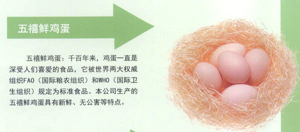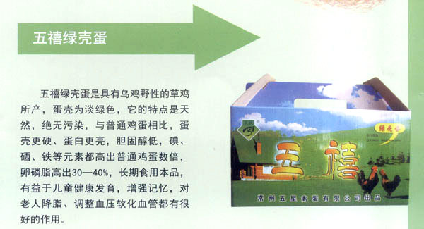 常州五星禽蛋有限公司創(chuàng)建于1990年,是常州市最大的禽蛋生產(chǎn)基地。公司秉承“辦實事、服務城市;上水平,掙創(chuàng)效益”的經(jīng)營宗旨。注重科技開發(fā)與管理創(chuàng)新,全力打造“五禧”品牌。公司于2000年通過了ISO9002質量體系認證;2004年又通過了無公害雞蛋產(chǎn)地和產(chǎn)品認證,并獲兩項專利。 經(jīng)多年努力實現(xiàn)了“五禧”產(chǎn)品系列化,F(xiàn)公司每年向市場提供有“五禧”鮮雞蛋,“五禧”土雞蛋,“五禧”ELC蛋,“五禧”綠殼草雞蛋,成為了不同消費群體的理想選擇!拔屐钡岸啻螛s獲常州市場知名商標稱號。
