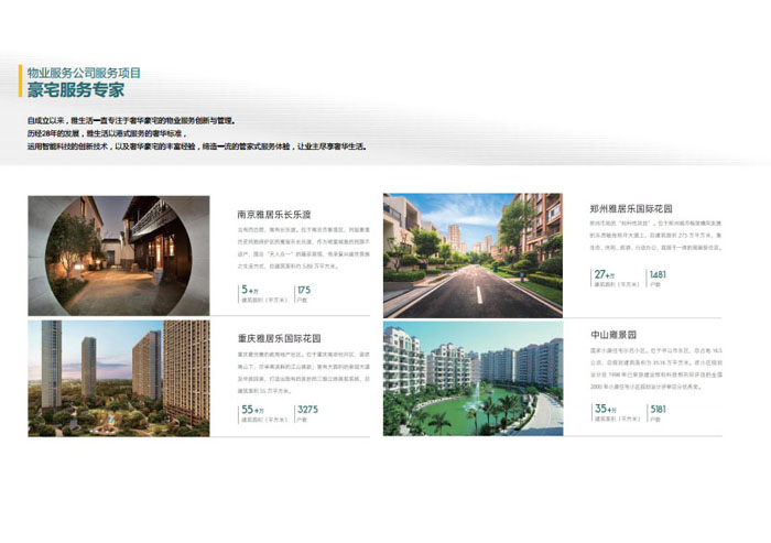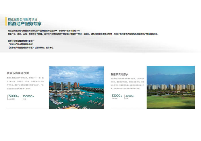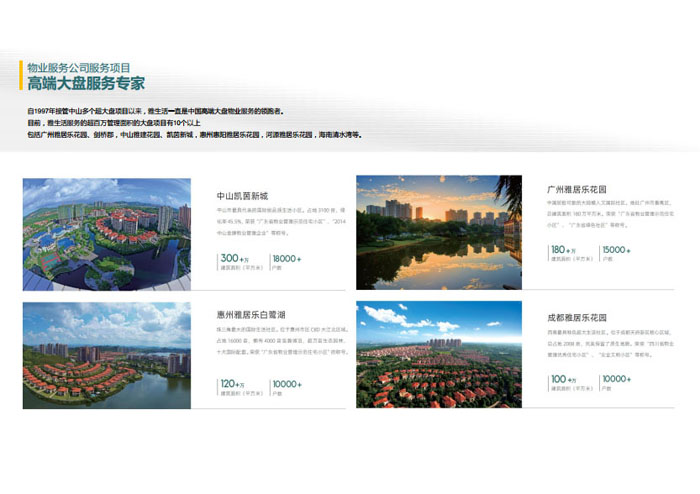 一、立足北上廣,面向全中國,走向全世界 1992年,雅居樂物業(yè)開篇中山,率先引入港式物業(yè)管理模式。1997年,依托雅居樂地產(chǎn)的崛起,連續(xù)接管中山多個項目,成為高端大盤物業(yè)管理的領(lǐng)跑者。1999年,雅居樂物業(yè)開啟專業(yè)化發(fā)展模式,全面通過英國皇家BSI的ISO9000質(zhì)量管理體系認證,2001年成為國家首批一級物業(yè)管理資質(zhì)企業(yè)。 2002年,隨著廣州雅居樂花園的盛大啟幕,雅居樂物業(yè)邁開向廣州進軍的步伐。為尋求更長遠的發(fā)展,雅居樂積極構(gòu)思上市藍圖,2005年在香港成功上市。在深耕珠三角城市群的同時,2006年雅居樂物業(yè)揮師北上,正式開啟全國部署戰(zhàn)略。2008年,接管海南清水灣項目,揭開旅游地產(chǎn)物業(yè)管理的新篇章。 接下來近十年里,雅居樂物業(yè)始終保持著最年輕的成長姿態(tài),依托“管理數(shù)字化、服務(wù)專業(yè)化、流程標準化和操作機械化”的發(fā)展戰(zhàn)略,雅居樂物業(yè)榮膺2018中國物業(yè)服務(wù)百強企業(yè)第11名,2018年中國物業(yè)服務(wù)百強企業(yè)成長性第二名、2018年中國物業(yè)服務(wù)百強服務(wù)質(zhì)量領(lǐng)先企業(yè)、2018年中國物業(yè)服務(wù)百強滿意度領(lǐng)先企業(yè)、2018中國物業(yè)服務(wù)百強經(jīng)營績效領(lǐng)先企業(yè)、旅游地產(chǎn)物業(yè)管理領(lǐng)先品牌、2018年中國辦公物業(yè)管理優(yōu)秀企業(yè)(綠地物業(yè))、2017中國物業(yè)管理企業(yè)品牌價值第12名、2017中國物業(yè)管理企業(yè)綜合實力第12名、中國藍籌物業(yè)企業(yè)、《旅游地產(chǎn)物業(yè)管理服務(wù)標準》(團體標準)起草工作等多項殊榮。 目前,雅生活集團已形成廣州、中山、深圳、南京、上海、西安、成都、海南、云南、北京、鄭州、南寧、沈陽、武漢、馬來西亞十五大城市公司全面發(fā)展的蓬勃態(tài)勢。截止2017年12月31日,雅生活集團管理范圍覆蓋全國逾69座城市與地區(qū),服務(wù)類型涵蓋主流住宅、高端豪宅、旅游地產(chǎn)、商業(yè)、寫字樓等多種業(yè)態(tài),合約總建筑面積為12610萬平方米,擁有200多個項目,服務(wù)業(yè)主逾100萬人。 2017年6月,雅生活集團收購綠地物業(yè)100%股權(quán),并與綠地集團簽署戰(zhàn)略合作協(xié)議,8月,綠地集團投資10億元獲得雅生活集團20%股權(quán)。未來,雅生活集團將實施“雅居樂物業(yè)”與“綠地物業(yè)”雙品牌驅(qū)動戰(zhàn)略,還將尋求在A股上市,力爭打造中國物業(yè)“A+H”第一股。