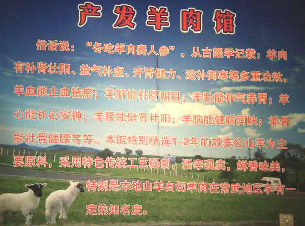俗話說:“冬吃羊肉賽人參”,從古醫(yī)學(xué)記載:羊肉有補(bǔ)腎壯陽、益氣補(bǔ)虛、開胃健力、滋補(bǔ)御寒等多重功效,羊血能止血丄祛瘀;羊肝能補(bǔ)肝明目;羊肚能補(bǔ)氣養(yǎng)胃;羊心能補(bǔ)心安神;羊腰能健胃壯陽;羊腦能健腦潤膚;羊骨能壯骨健腰等等。本館特別精選1-2年的放養(yǎng)公山羊?yàn)橹饕,采用特色傳統(tǒng)工藝秘制,活宰現(xiàn)賣,鮮香味美,特別是本地山羊白切羊肉在常武地區(qū)享有一定的知名度。