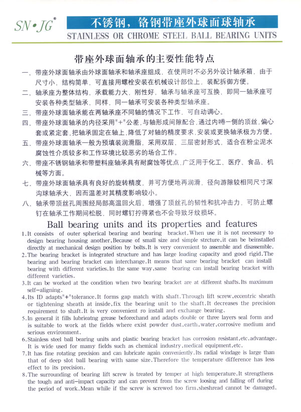 常州市武進蘇南軸承有限公司是生產(chǎn)鋼球及帶座外球面軸承的專業(yè)工廠,主要生產(chǎn)蘇南牌“SN”不銹鋼球、鉻鋼鋼球,以及不銹鋼、鉻鋼UC、UCX、UK、HC、SB、SA、SER、UOOO、KOOO及其它非標系列各類帶座外球面軸承、偏心套、緊定套等產(chǎn)品。本廠生產(chǎn)規(guī)格有軸承鋼球0.5-150m/m,碳鋼球0.5-150m/m,不銹鋼球0.8-50m/m,同時定做各種特殊規(guī)格的不銹鋼球、銅球、陶瓷球等。為廣大用戶提供品質優(yōu)良,規(guī)格齊全,價格合理的各種鋼球。 本公司位于常州南部,錫宜高速公路串境而過, 交通便利。南瀕風景秀麗的太湖,沿湖丘陵地帶人文景觀豐富,為常州市武進區(qū)太湖旅游度假區(qū) 。本廠環(huán)境優(yōu)美,具有良好的生產(chǎn)環(huán)境,我們竭誠歡迎國內外的朋友進行廣泛多樣的經(jīng)濟合作交往和貿易合作,并為你提供優(yōu)良的服務。 本公司技術力量雄厚,工藝裝備先進,檢測手段完備,產(chǎn)品質量穩(wěn)定,使用性能各項指標都達到國際先進水平,產(chǎn)品主要銷往美國、法國、德國、日本、意大利、澳大利亞、韓國、加拿大、及東南亞等國家和地區(qū)。本公司的“SN”商標鋼球及帶座外球面軸承已贏得國內外廣大用戶的信賴。 本公司具有外貿自營出口權,并于2002年9月通過ISO9001-2000版質量體系認證,于2004年8月通過“CQC”產(chǎn)品質量認證。