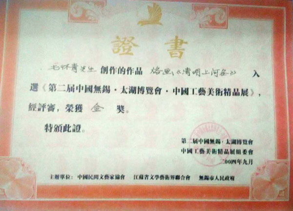 毛懷青,江蘇常州市武進(jìn)人。 中國工藝美術(shù)學(xué)會會員,常州市中國烙畫研究會副會長,常州市文博鑒賞協(xié)會理事,非物質(zhì)文化遺產(chǎn)烙畫傳承人。高級工藝美術(shù)師。 年輕時(shí)學(xué)習(xí)國畫、油畫中年蔓現(xiàn)掌州咯畫源遠(yuǎn)流長、歷史悠久,有著其它美術(shù)門類不具備的藝術(shù)風(fēng)格與特色?芍^是工藝美術(shù)中的一朵十分亮麗的藝術(shù)奇葩,是我民族先人給我們留下的一份不可多得十分珍貴的一份文化遺產(chǎn)。為弘揚(yáng)與發(fā)展這份優(yōu)秀文化遺產(chǎn),我從此下定決心研究烙畫,愿付出一份力量為振興烙畫事業(yè)做出貢獻(xiàn)。至今已潛心研究幾十年,取得了可喜的成績,被業(yè)界公認(rèn),社會關(guān)注與認(rèn)可。有“江南烙畫第一筆”之美譽(yù)。 近年來,創(chuàng)作的烙畫作品分別獲得過全國、省市級的金、銀、銅獎多次。中央電視臺曾兩次播放過本人的烙畫作品,江蘇電視臺、常州電視臺也曾多次播放過本人的作品與烙畫藝術(shù)生涯,揚(yáng)子晚報(bào)、常州日報(bào)、常州晚報(bào)也曾多次報(bào)導(dǎo)過本人的烙畫作品,出版物有三種版本都能查閱到介紹本的烙畫從藝生涯與藝術(shù)業(yè)績。