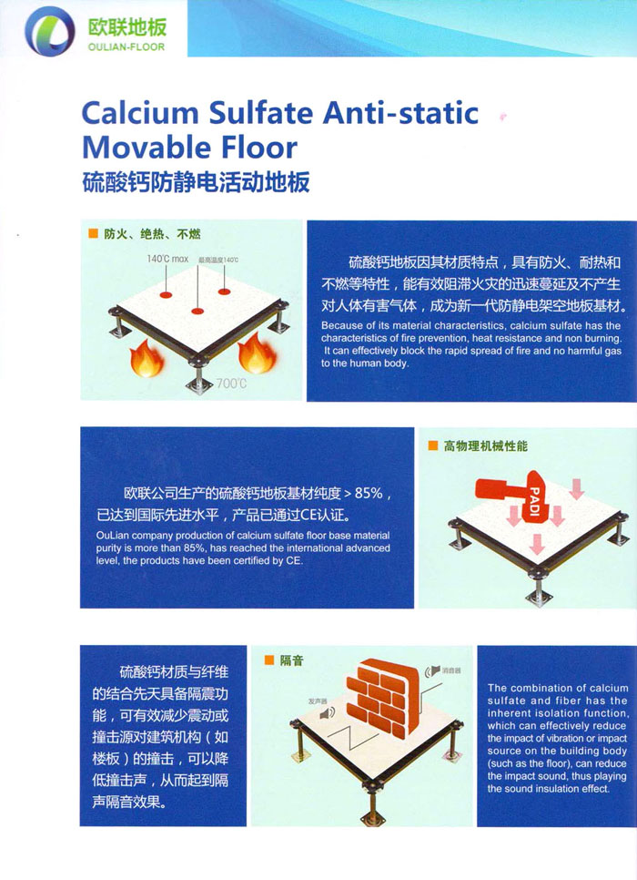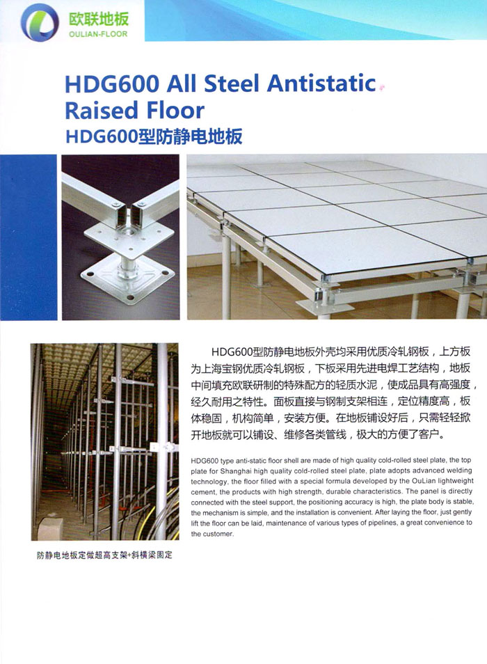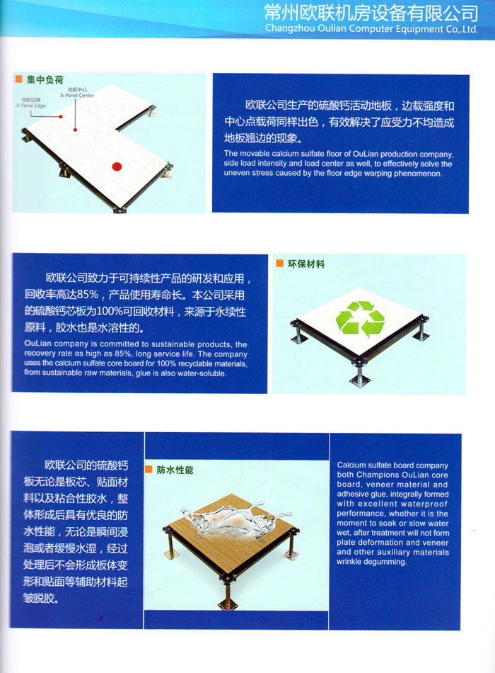 防靜電高架活動地板、全鋼地板、陶瓷地板是計算機行業(yè)發(fā)展起來的新型鋪地材料,隔離了潮氣、靜電灰塵,最重要的是解決了綜合布線問題,無需預埋管線,可隨時拆卸、搬移,保證了資訊設備完整的優(yōu)點,適應了智能化樓宇中信息自動化技術(shù)對所處環(huán)境的特定要求,避免了廣大客戶的雙重投資,使現(xiàn)代化辦公程度更加高效,辦公場所更加舒適。 “歐聯(lián)”系列全鋼地板,符合國家安全要求,種類完備多樣,其中防靜電陶瓷地板、硫酸鈣地板等除具有普通瓷質(zhì)的裝飾和實用性外,其耐磨、防水、防火功能優(yōu)于其它同類產(chǎn)品,防靜電系列地板,能切合不同客戶的要求,其靈活的配置,深受客戶歡迎,不同材質(zhì)的地板結(jié)構(gòu)使設計師的設計空間比傳統(tǒng)的更加廣闊自由和善變。 公司大力發(fā)展國內(nèi)外銷售業(yè)務,多次中標國內(nèi)重點工程 ,例:哈爾濱醫(yī)科大學、山東大學、上海普通機場等。 公司將一如既往開發(fā)和制造一流的產(chǎn)品,愿與廣大有識之士合作發(fā)展,共創(chuàng)美好未來。