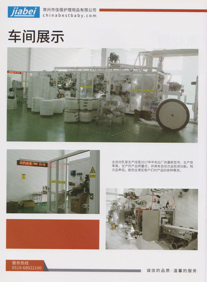 常州市佳蓓護(hù)理用品有限公司是一家專業(yè)從事開發(fā)、生產(chǎn)、銷售并具備自營出口的外向型企業(yè),主要生產(chǎn)“一次性防溢乳墊“,以質(zhì)量穩(wěn)定,柔軟親膚而深受客戶和消費者青睞。本公司產(chǎn)品從生產(chǎn)到包裝成品嚴(yán)格執(zhí)行無菌生產(chǎn)標(biāo)準(zhǔn)化流程,并和設(shè)備生產(chǎn)廠家合作開發(fā)了兩條從進(jìn)料、生產(chǎn)、檢測、滅菌、成品包裝的無菌生產(chǎn)線,從而實現(xiàn)了真正意義上的無菌生產(chǎn)標(biāo)準(zhǔn)化。