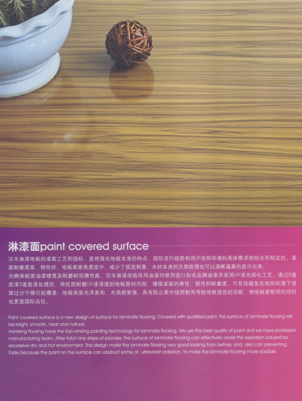 常州漢豐裝飾材料有限公司是一家涉及強化地板制造、屏風鋁材生產(chǎn)、進出口貿(mào)易的大型公司。2001年公司投入重資.全面引進世界頂級一體化自動流水生產(chǎn)線和具有國際先進水準的德國權(quán)威木地板生產(chǎn)技術(shù),興建強化地板生產(chǎn)基地。多年以來.一直不斷加強生產(chǎn)設備、廠房基礎(chǔ)投入,目前公司年生產(chǎn)強化地板能力已經(jīng)達到了500萬平方米,步入國內(nèi)一流行列,具備了雄厚的國際競爭力。 漢豐地板以奉獻生活中最完美的地板為發(fā)展目標,時尚流行的設計風格和多樣化的產(chǎn)品類型,贏得了市場的廣泛贊譽和肯定。產(chǎn)品嚴格按照歐洲標準檢測強化木地板的各項性能指標.達到百分百的國際技術(shù)標準,確保了每一塊地板都有著上乘品質(zhì),是綠色環(huán)保的好地板。并先后通過了Isc)9001國際質(zhì)量管理體系認證,IS014001國際環(huán)境管理體系認證.中國環(huán)境標志產(chǎn)品認證,深得用戶的一致好評,是寫字樓、商場、大型超市、學校、建筑樓宇、娛樂場所、家用私宅等鋪裝的首選地板。