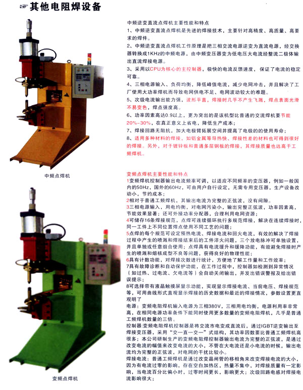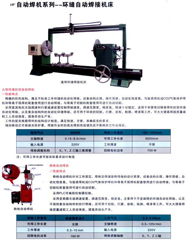焊割主要產(chǎn)品有:點(diǎn)焊機(jī)系列、縫焊機(jī)系列、環(huán)縫焊接機(jī)床、凸焊機(jī)、排焊機(jī)、儲(chǔ)能焊機(jī)、對焊機(jī)、龍門焊機(jī)、太陽能焊接設(shè)備和機(jī)器人焊接系統(tǒng)及外圍設(shè)備等;并為用戶設(shè)計(jì)制造專用焊接設(shè)備。