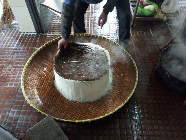第一步:蒸糯米飯,老徐先用煤爐將水燒開(kāi),再將洗凈泡好的糯米放入一只大木桶中,放在爐子上蒸。除此以外,老徐還要不斷攪拌,保證糯米受熱均勻,直至散發(fā)出水蒸氣。為了保證米飯溫度,老徐特地用塑料薄膜將木桶封住,并用皮筋加固。蒸糯米飯,大約需要半個(gè)多小時(shí)。