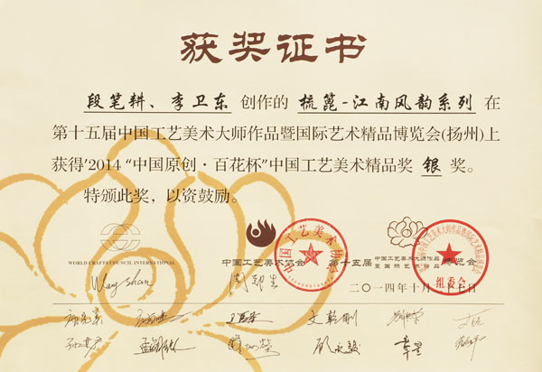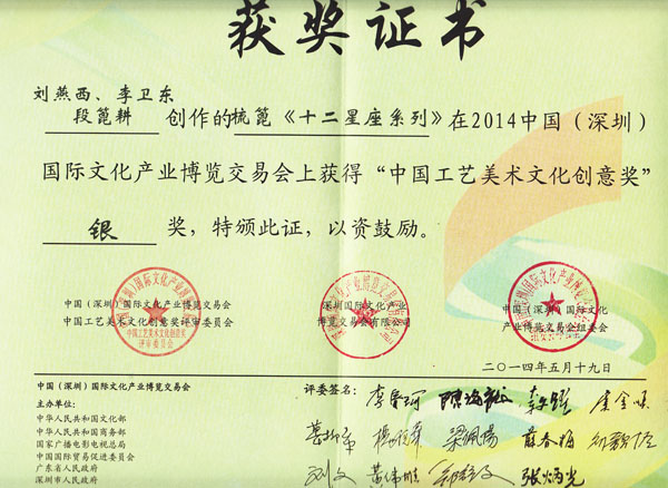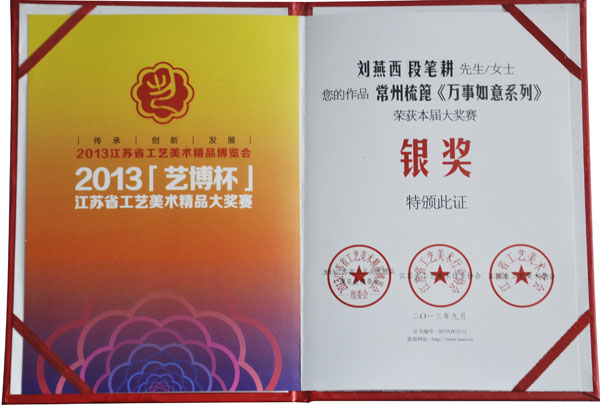 公司榮譽(yù)介紹: “2009年常州市旅游商品創(chuàng)新設(shè)計(jì)大賽”,“覽盡千荷”綠檀雕刻梳榮獲三等獎(jiǎng); “2011年常州市旅游商品創(chuàng)新設(shè)計(jì)大賽”,“彩印工藝梳-我們的年代(80)”榮獲二等獎(jiǎng)。 “2011年中國包裝創(chuàng)意設(shè)計(jì)大賽“,虞美人彩印梳篦系列包裝獲得一等獎(jiǎng); “2011年中國包裝創(chuàng)意設(shè)計(jì)大賽”,虞美人筷子系列包裝獲得三等獎(jiǎng); “2011創(chuàng)意中國.第五屆設(shè)計(jì)藝術(shù)大獎(jiǎng)賽”,虞美人系列包裝獲得三等獎(jiǎng); “2011首屆中國(無錫)國際文化藝術(shù)博覽會(huì)”,漆藝對(duì)梳《喜玫瑰》獲得“藝博杯“銅獎(jiǎng)。 “第十三屆中國工藝美術(shù)大師作品暨國際藝術(shù)精品博覽會(huì)”, 漆藝梳《報(bào)喜鳥》榮獲2012“儒士儒家•百花杯”中國工藝美術(shù)精品獎(jiǎng)優(yōu)秀獎(jiǎng) “第十三屆中國工藝美術(shù)大師作品暨國際藝術(shù)精品博覽會(huì)”, 虞美人《渾然天成》榮獲2012“儒士儒家•百花杯”中國工藝美術(shù)精品獎(jiǎng)金獎(jiǎng) “2012江蘇省工藝美術(shù)精品大獎(jiǎng)賽”,虞美人《S型梳》喜獲“藝博杯”銀獎(jiǎng) “第十四屆中國工藝美術(shù)大師作品暨國際藝術(shù)精品博覽會(huì)”, 虞美人工藝梳《新型十二星座梳》榮獲2013“國信•百花杯”中國工藝美術(shù)精品獎(jiǎng)優(yōu)秀獎(jiǎng) “2013【藝博杯】江蘇省工藝美術(shù)精品大獎(jiǎng)賽”,虞美人《萬事如意系列》喜獲“藝博杯”銀獎(jiǎng) “2013江蘇省工藝美術(shù)新人新作成果展作品大獎(jiǎng)賽”,虞美人《壺(福)的藝術(shù)》喜獲“藝博杯”入圍獎(jiǎng) 2013年度江蘇省“蘇商領(lǐng)袖峰會(huì)”,常州市卓尚飾品有限公司榮獲最具成長性企業(yè)獎(jiǎng) 常州市卓尚飾品(虞美人)有限公司總經(jīng)理李衛(wèi)東榮獲“常州創(chuàng)意產(chǎn)業(yè)協(xié)會(huì)2013年底慈善獎(jiǎng)榮譽(yù)” 常州市卓尚飾品有限公司榮獲薛家鎮(zhèn)人民政府2013年度“創(chuàng)新創(chuàng)優(yōu)”獎(jiǎng) 常州市卓尚飾品有限公司榮獲薛家鎮(zhèn)人民政府2013年度“銷售業(yè)績”獎(jiǎng) 2014中國(深圳)國際文化產(chǎn)業(yè)博覽交易會(huì),劉燕西、李衛(wèi)東、段筆耕<十二星座系列>獲得“中國工藝美術(shù)文化創(chuàng)意獎(jiǎng)”銀獎(jiǎng) 2014中國(深圳)國際文化產(chǎn)業(yè)博覽交易會(huì),徐德鴻、李衛(wèi)東、段筆耕《漆彩人生系列》獲得“中國工藝美術(shù)文化創(chuàng)意獎(jiǎng)”銅獎(jiǎng) 文化創(chuàng)意大獎(jiǎng)賽“紫金獎(jiǎng)” ,有余(魚)系列梳篦產(chǎn)品獲得了優(yōu)秀獎(jiǎng) 2014吟飛杯首屆常州文化創(chuàng)意和設(shè)計(jì)大賽,虞美人有余(魚)系列梳篦產(chǎn)品榮獲優(yōu)秀設(shè)計(jì)獎(jiǎng) 2014吟飛杯首屆常州文化創(chuàng)意和設(shè)計(jì)大賽,虞美人“云,月”系列梳篦產(chǎn)品榮獲優(yōu)秀設(shè)計(jì)獎(jiǎng) 2014藝博杯江蘇省工藝美術(shù)精品大獎(jiǎng)賽,虞美人《梳篦:酒醉的探戈》喜獲銀獎(jiǎng) 2014“中國原創(chuàng)•百花杯”中國工藝美術(shù)精品大獎(jiǎng)賽,虞美人《梳篦-江南風(fēng)韻系列》喜獲銀獎(jiǎng) 常州市卓尚飾品有限公司獲“2014年常州市電子商務(wù)協(xié)會(huì)2014年度優(yōu)秀會(huì)員單位” 2014“虞美人”成為常州市知名商標(biāo)。