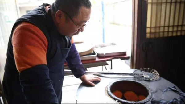 當(dāng)爐火燒得正旺,溫度能高達(dá)近300度,沈國(guó)平就上場(chǎng)了,赤手空拳,一撈一貼,一秒鐘的功夫,就把麻糕貼到了桶壁上。不過(guò)幾分鐘的功夫,麻糕就出爐了。經(jīng)過(guò)炭火爐子烤出來(lái)的,比一些電烤爐烤出的更香、更脆。