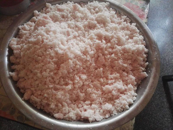 每天凌晨一兩點(diǎn)鐘,沈國(guó)平就要去采買當(dāng)天最新鮮的豬板油,回來(lái)清理干凈,和上面粉攪拌均勻,制成面團(tuán)。麻糕的制作主要由沈國(guó)平妻子和兩個(gè)姊妹來(lái)完成。揉面、搓胚子、配油酥,按餡心、搟均勻,整個(gè)過(guò)程行云流水,連貫無(wú)比。