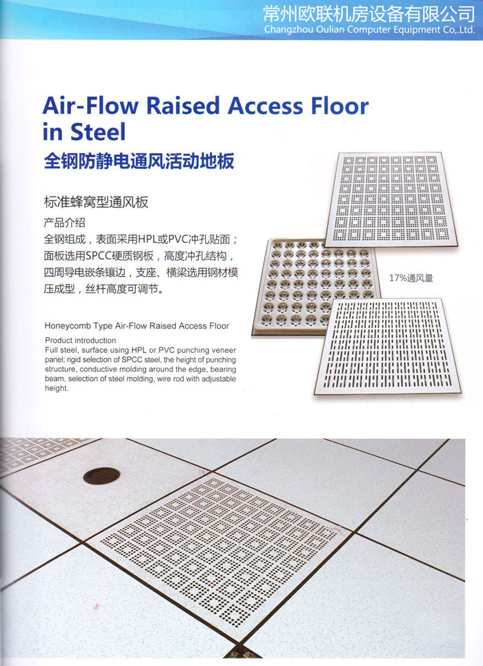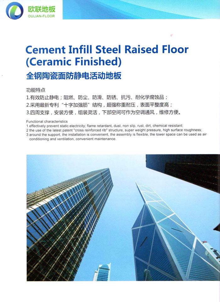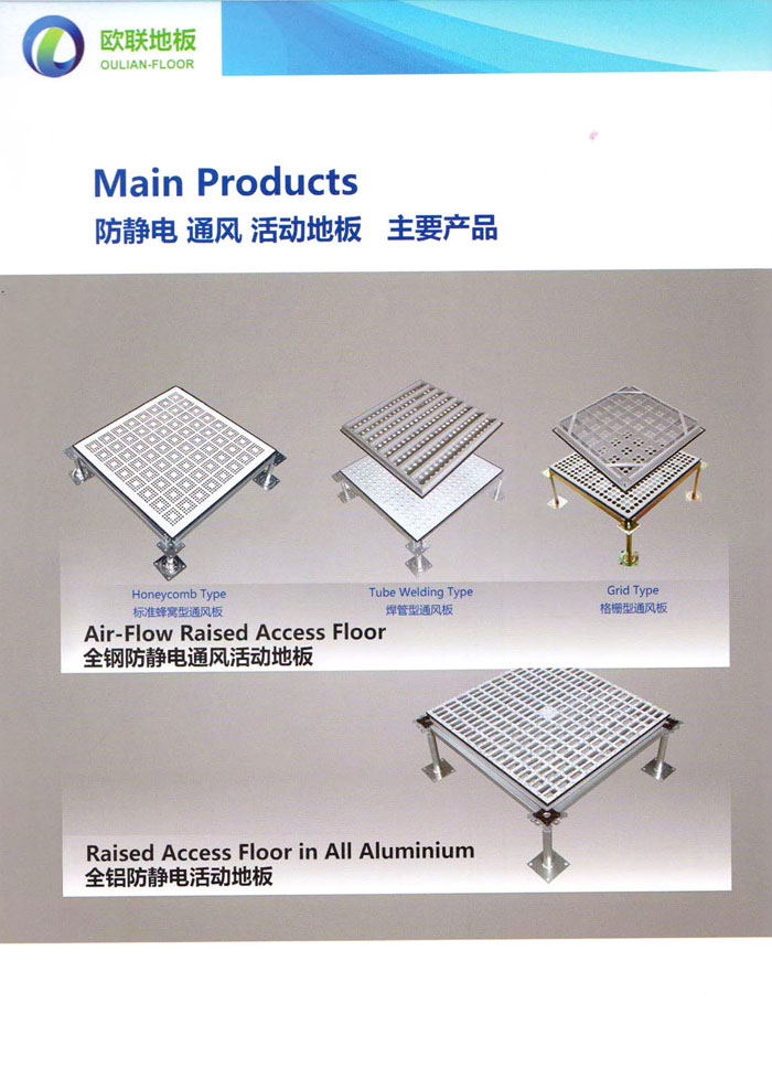 防靜電高架活動(dòng)地板、全鋼地板、陶瓷地板是計(jì)算機(jī)行業(yè)發(fā)展起來的新型鋪地材料,隔離了潮氣、靜電灰塵,最重要的是解決了綜合布線問題,無需預(yù)埋管線,可隨時(shí)拆卸、搬移,保證了資訊設(shè)備完整的優(yōu)點(diǎn),適應(yīng)了智能化樓宇中信息自動(dòng)化技術(shù)對(duì)所處環(huán)境的特定要求,避免了廣大客戶的雙重投資,使現(xiàn)代化辦公程度更加高效,辦公場(chǎng)所更加舒適。 “歐聯(lián)”系列全鋼地板,符合國(guó)家安全要求,種類完備多樣,其中防靜電陶瓷地板、硫酸鈣地板等除具有普通瓷質(zhì)的裝飾和實(shí)用性外,其耐磨、防水、防火功能優(yōu)于其它同類產(chǎn)品,防靜電系列地板,能切合不同客戶的要求,其靈活的配置,深受客戶歡迎,不同材質(zhì)的地板結(jié)構(gòu)使設(shè)計(jì)師的設(shè)計(jì)空間比傳統(tǒng)的更加廣闊自由和善變。 公司大力發(fā)展國(guó)內(nèi)外銷售業(yè)務(wù),多次中標(biāo)國(guó)內(nèi)重點(diǎn)工程 ,例:哈爾濱醫(yī)科大學(xué)、山東大學(xué)、上海普通機(jī)場(chǎng)等。 公司將一如既往開發(fā)和制造一流的產(chǎn)品,愿與廣大有識(shí)之士合作發(fā)展,共創(chuàng)美好未來。