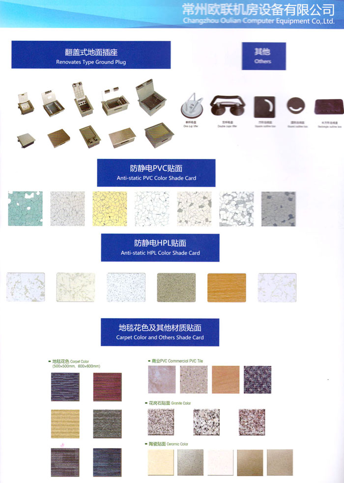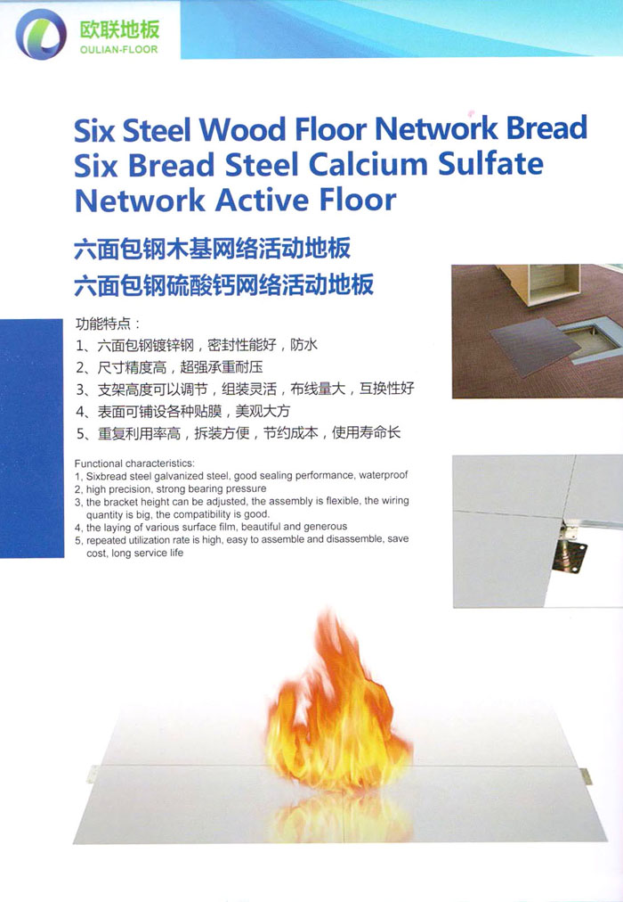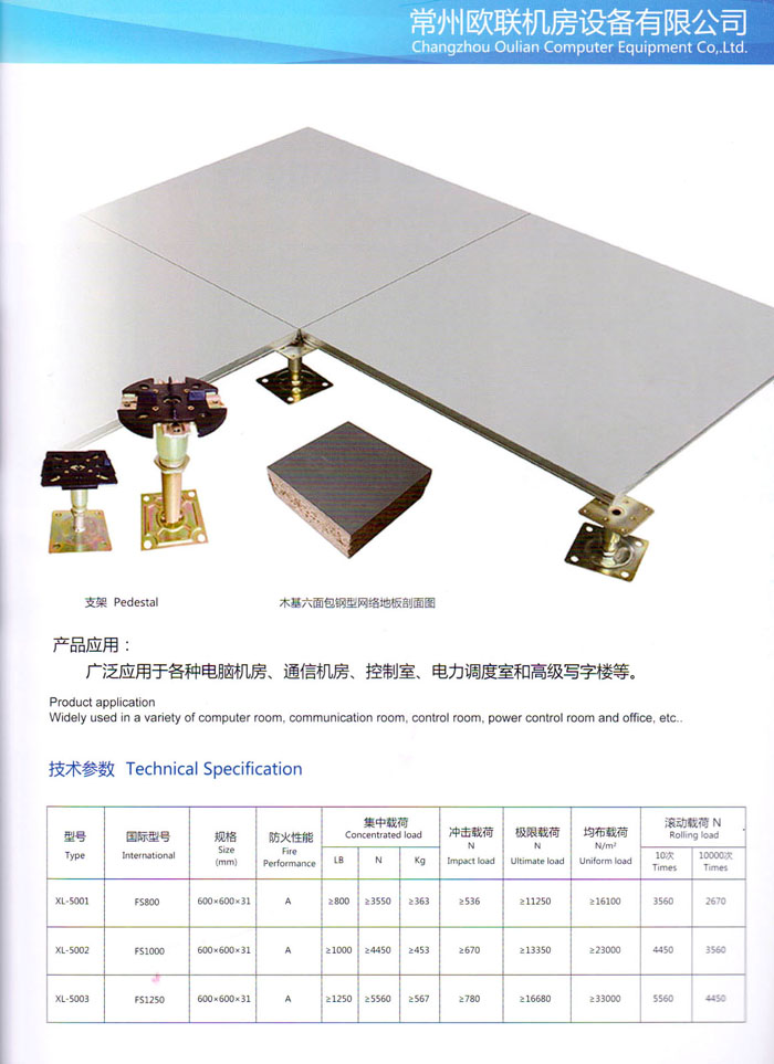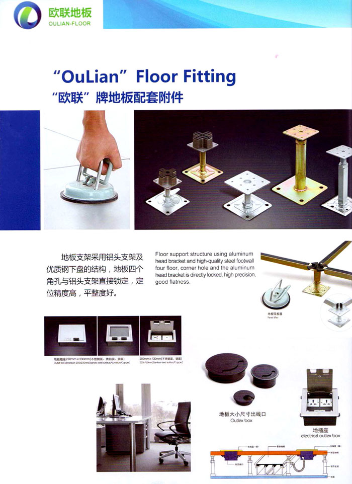 防靜電高架活動(dòng)地板、全鋼地板、陶瓷地板是計(jì)算機(jī)行業(yè)發(fā)展起來的新型鋪地材料,隔離了潮氣、靜電灰塵,最重要的是解決了綜合布線問題,無需預(yù)埋管線,可隨時(shí)拆卸、搬移,保證了資訊設(shè)備完整的優(yōu)點(diǎn),適應(yīng)了智能化樓宇中信息自動(dòng)化技術(shù)對所處環(huán)境的特定要求,避免了廣大客戶的雙重投資,使現(xiàn)代化辦公程度更加高效,辦公場所更加舒適。 “歐聯(lián)”系列全鋼地板,符合國家安全要求,種類完備多樣,其中防靜電陶瓷地板、硫酸鈣地板等除具有普通瓷質(zhì)的裝飾和實(shí)用性外,其耐磨、防水、防火功能優(yōu)于其它同類產(chǎn)品,防靜電系列地板,能切合不同客戶的要求,其靈活的配置,深受客戶歡迎,不同材質(zhì)的地板結(jié)構(gòu)使設(shè)計(jì)師的設(shè)計(jì)空間比傳統(tǒng)的更加廣闊自由和善變。 公司大力發(fā)展國內(nèi)外銷售業(yè)務(wù),多次中標(biāo)國內(nèi)重點(diǎn)工程 ,例:哈爾濱醫(yī)科大學(xué)、山東大學(xué)、上海普通機(jī)場等。 公司將一如既往開發(fā)和制造一流的產(chǎn)品,愿與廣大有識之士合作發(fā)展,共創(chuàng)美好未來。
